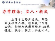 缙云颔首嘉陵欢歌山环水绕钟灵毓秀,在重庆后花园北碚有一所大学里的中学中学里的大学西南大学 附属中学简称西大附中西师附中隶属于国家教育部直属重点综合大学国家211工程重点建设学校西南大学原西南师范大学和西南农业大学于2005年合并而建西大附中是重庆市教委直属重点中学她依托师范大学雄厚的教育科研人才优势丰富的人文科技资源幽雅的育人环境密切与大学各院系的联系聘请大学名家教授走进中学让中学生走进大学感受名家大师风范接受大学精神熏陶和前沿科技人文信息真正地实施了严谨而大气的英才教育和通才教育形成了西大附中独有的 大学里的中学中学里的大学的办学风格学校荟萃自然与人文教育之精髓以人的培养和完善为终极目标以办学的示范性强教育质量高育人环境好而声名远播于2011年12月9日我校主办的西南师范大学附属中学更名仪式上正式更名为西南大学附属中学并秉持办大学里的中学中学里的大学的理念继续推进把时间还学生把平台给学生以自主引自觉以交流激思维以体验生内驱让教育活起来让学生秀出来的思想希望附中学生能知行合一志存高远成长为栋梁之才