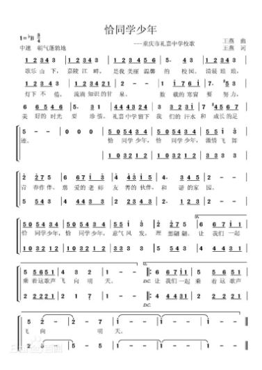 恰同学少年,恰同学少年,激情飞舞青春作伴。慈爱的老师友善的伙伴,和谐的家园。恰同学少年,恰同学少年, 意气风发,理想翩翩。让我们一起乘着这歌声飞向明天。让我们一起乘着这歌声飞向明天。
